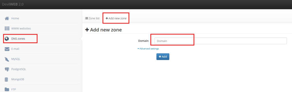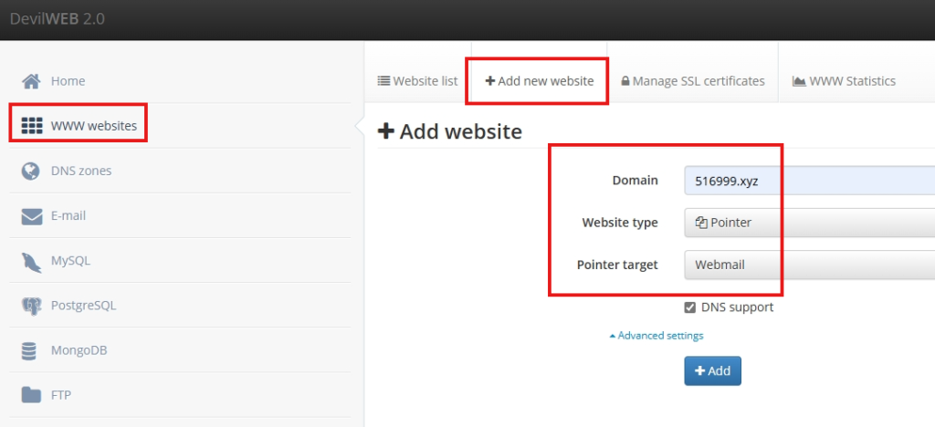 选择www websites,点击上面的+add new website,填写你邮箱域名,点击Adance setting,选择pointer, Webmail,这样你的域名可以直达邮箱管理面板!