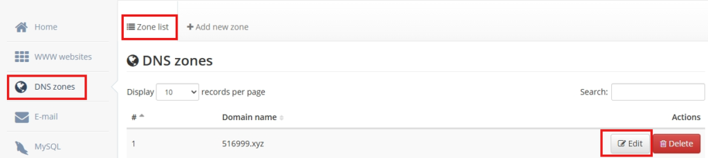 在完成域名绑定后,我们需要查看需要添加的域名记录,请依次点击,DNS Zones,ZoneList,选择你需要的域名,点击Edit。