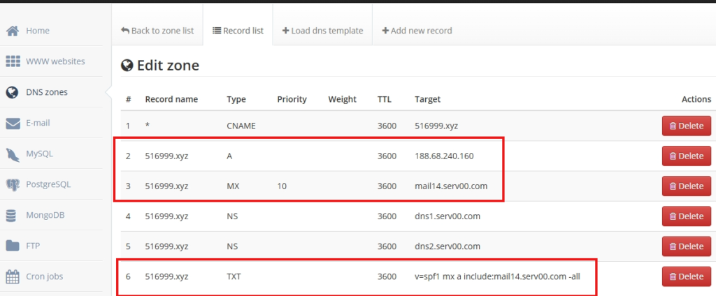 当然,你可能并不需要完全按照下面的6条记录,但是其中A,MX,TXT三条记录必须填写。