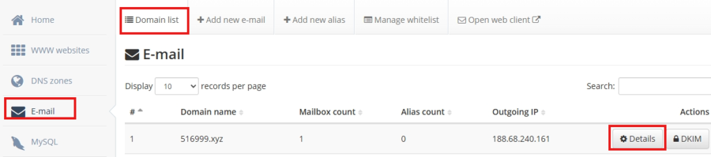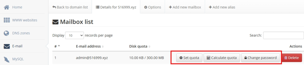 添加完成后,可以在Domain List下对于的域名,点击Details对添加的邮箱进行管理。比如设置可使用的空间大小,修改密码等操作。