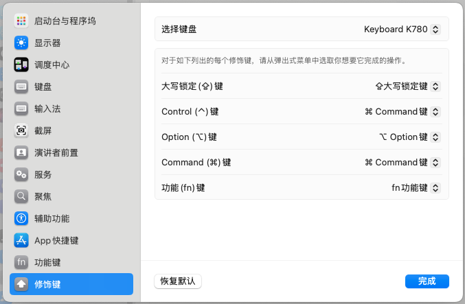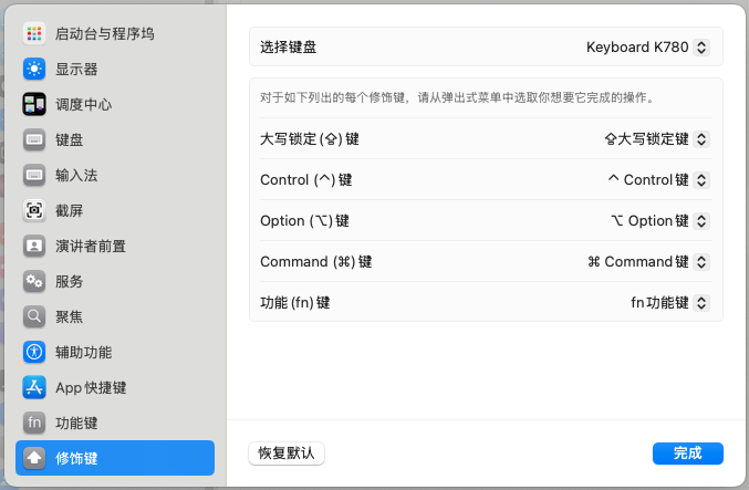在mac系统里面,键盘的选项里面,有个修饰键的概念,可以用于交换按键功能。操作如下: