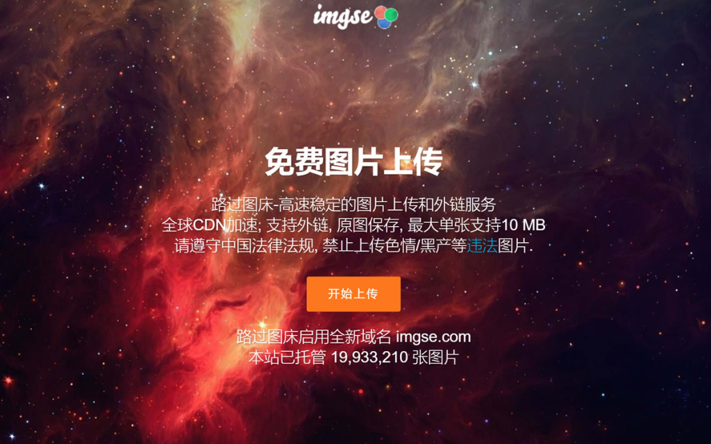 Imgse.com提供免费图床分享多年,是始于2011年的国内老牌免费图床,无限存储空间,无限流量,图片上传最大单张支持10MB,原图保存,支持直接外链分享你上传的图片,免费用户限每小时最多上传60张图片。