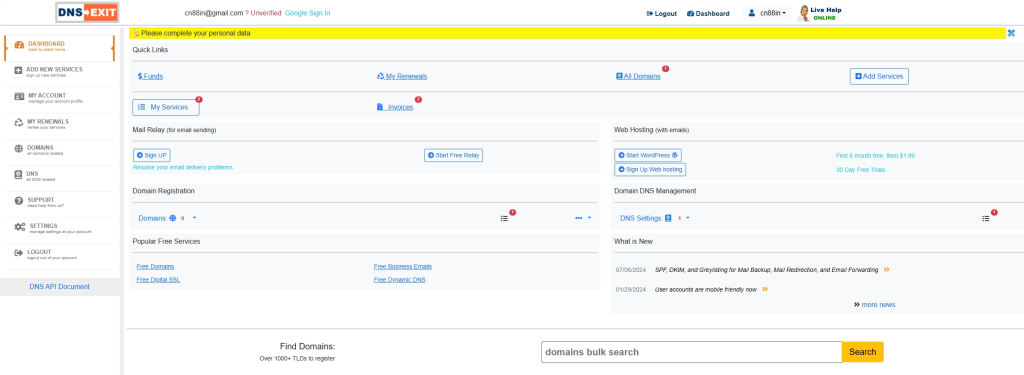 DNSExit从2001年开始提供免费域名DNS解析和动态DNS解析,后续又陆续推出了免费二级域名、免费企业邮箱、免费SSL安全证书等免费服务。