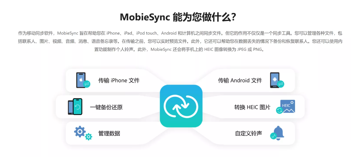 MobieSync 是一款实用的文件传输管理工具,支持在电脑上轻松管理 iOS 和 Android 设备的文件,包括图片、音频、视频、联系人、短信等内容,助您快速完成传输与管理操作。