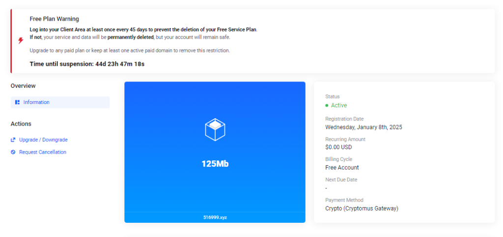WebHostMost.com是一支由爱好者组成的团队,提供 125Mb 的磁盘空间用于小型项目的PHP+MySQL空间。号称不需要额外付费、不会消失、不会用广告打扰您、可以正常工作的空间!申请支付时选择加密货币Crypto就无需填写信用卡等信息,